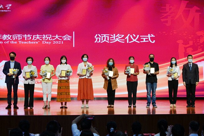 本次教师节庆祝大会简朴隆重、主题突出,并通过视频同步直播,广大教职工深感温暖,倍受感动。离退休校领导代表,获奖教师代表,各二级单位教职工代表,离退休教职工代表,外籍教师代表等共计460余人参加会议。
